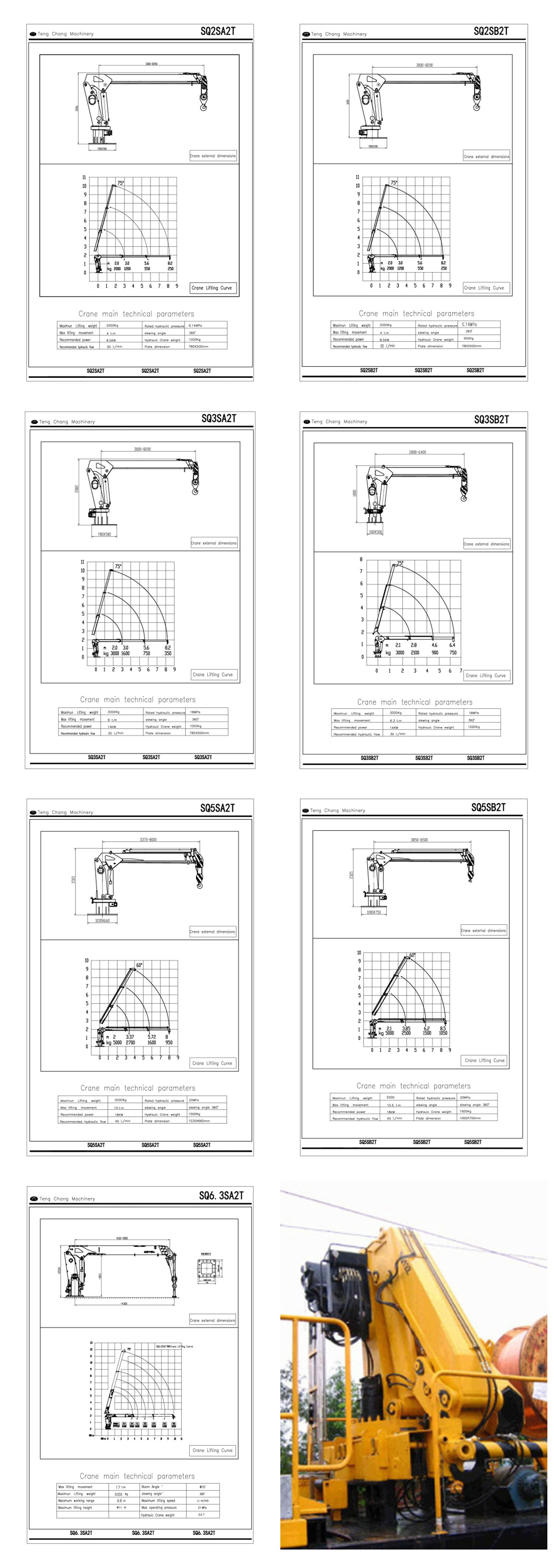 A: The crane supports maximum lifting weights of 2t, 3t, 5t, and 6.3t depending on the model, with lifting moments ranging from 4 to 17 t.m for flexible operations.